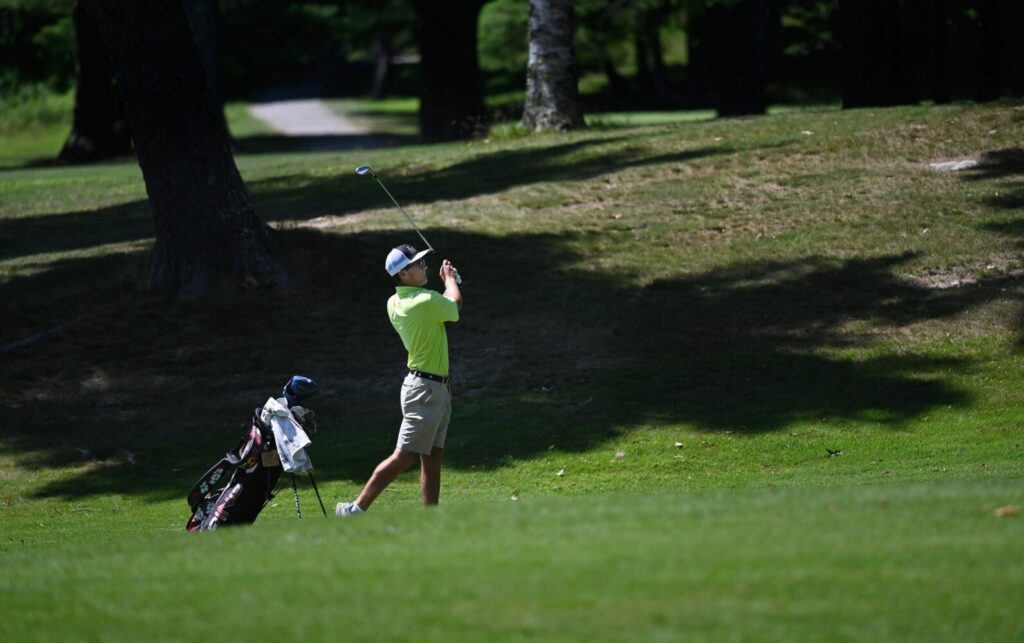 Caleb Manuel takes an approach shot on the second hole during the final round of the Maine Junior Championship at the Gorham Country Club on Wednesday. Shawn Patrick Ouellette/Portland Press Herald