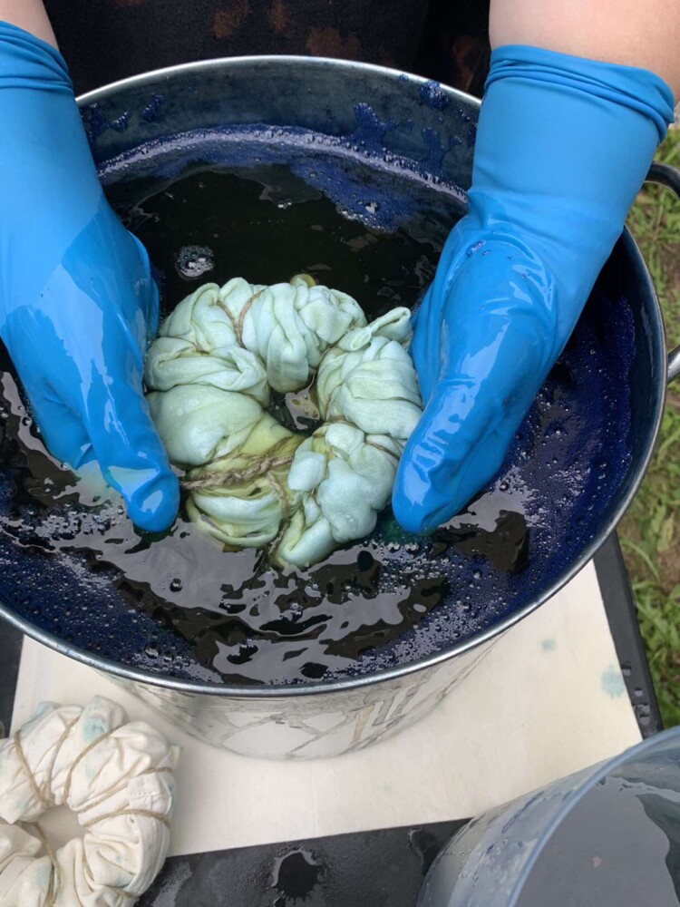 Blue gloves in the vat; this is a shibori in the reduced indigo. Indigo must be reduced (break an oxygen atom off the indigo molecule) in order to dye anything. When it’s reduced, indigo loses its blue color and gets trapped in all the weak spots of fibers, making fabric stronger and that lasts longer, according to one of the teachers, Rebecca Zicarelli. Blake Tripp