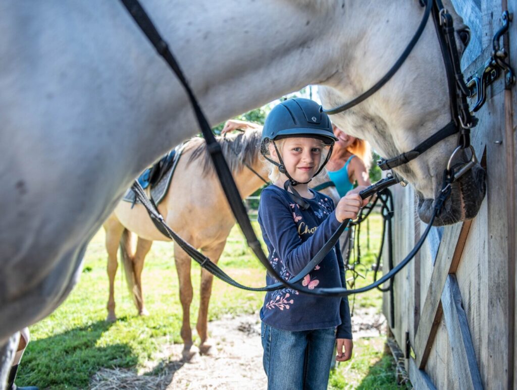 Blix van den Berg, 6, holds her assigned horse on the second day of Few Acre Farm’s mini horse camp on Witham Road in Auburn on Friday. In addition to saddle and bareback riding, campers learned about horse nutrition and barn chores. Andree Kehn/Sun Journal Buy this Photo