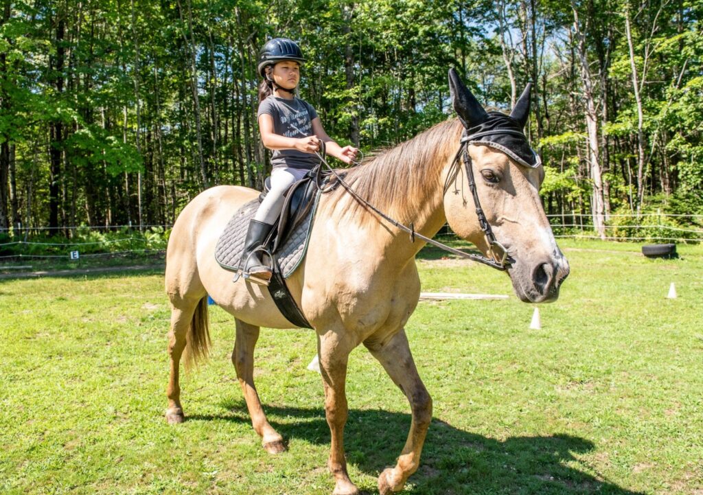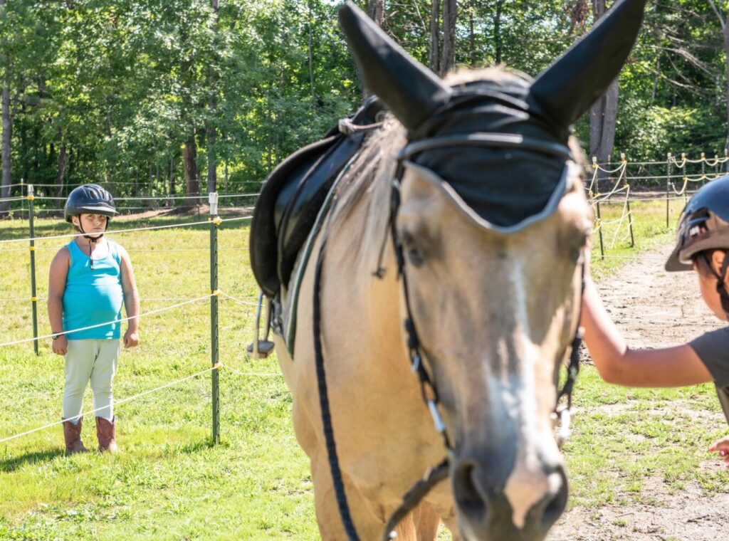 Stella Johnson, 8, watches a rider prepare to mount a horse on the second day of Few Acre Farm’s mini horse camp on Witham Road in Auburn on Friday. It was the second day Johnson has ever ridden. Andree Kehn/Sun Journal Buy this Photo