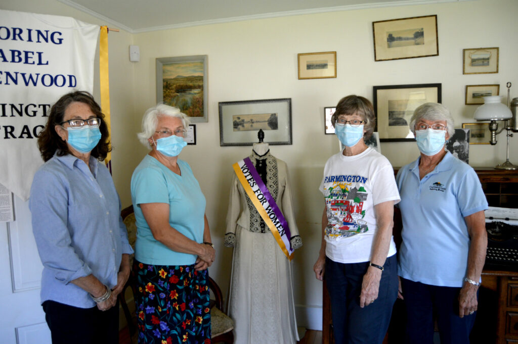 Recently elected officers of the Farmington Historical Society pose Friday with Isabel Greenwood’s wedding dress on display at the Titcomb House. The officers also planned a Woman’s Suffrage Centennial March for August 18, the 100th anniversary of ratification of the 19th Amendment. Pictured from left, Marion Scharoun, president; Jane Woodman, vice-president; Claudia Bell, secretary and Janice Maxham, treasurer. The officers observed COVID 19 recommendations to wear masks for the photo. Photo courtesy of Ann Bryant