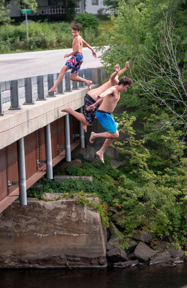 Trevin Albert, left, Noah Marston and Jaiden Jack, all from Buckfield, jump off of the bridge Sunday afternoon over the Nezinscot River in Turner. The boys said they have never touched the bottom of the river when jumping off the bridge. Andree Kehn/Sun Journal Buy this Photo