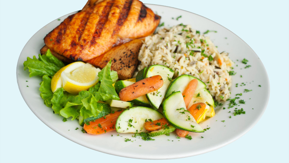 Half of the plate should be filled with natural color — fruits and vegetables — and at least a quarter with lean protein. One-eighth to one-quarter of the plate should hold grains.