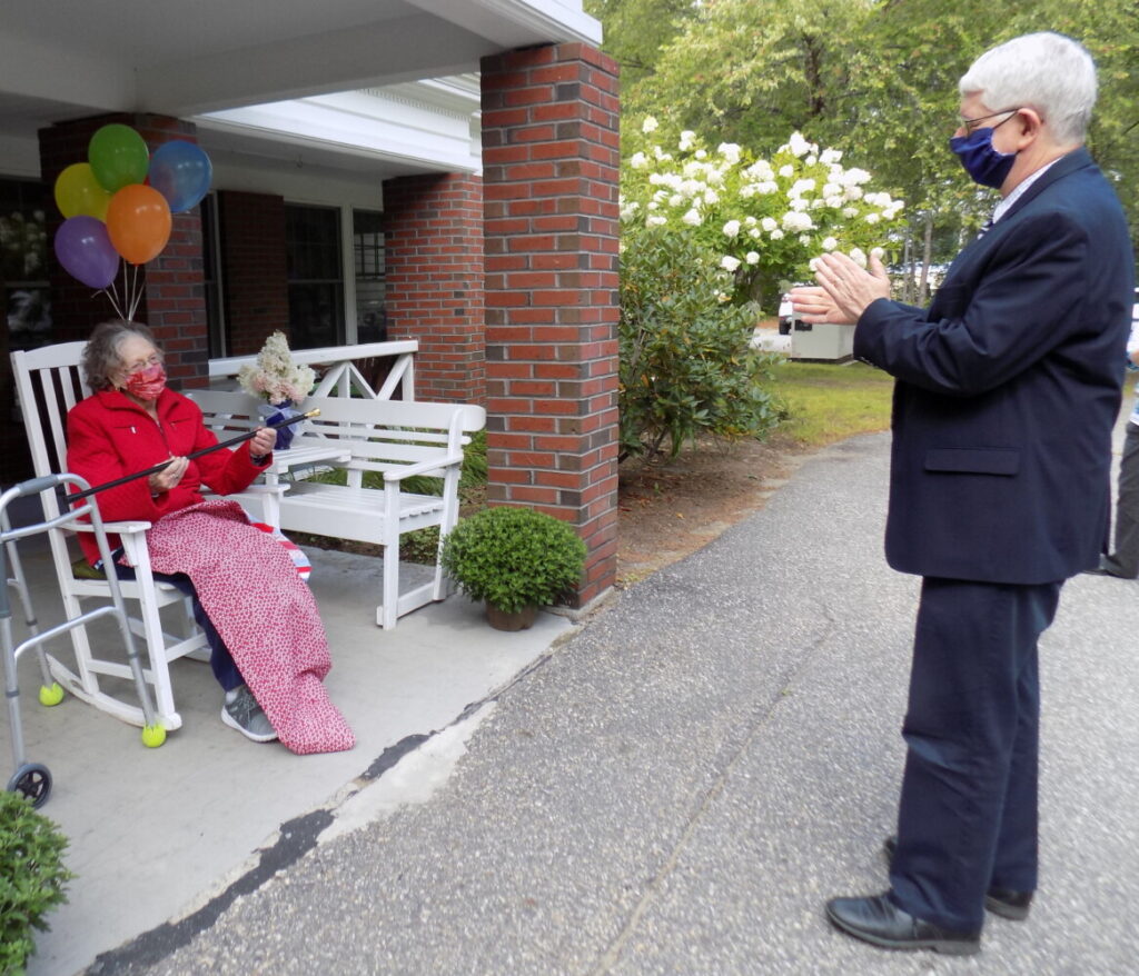 Farmington Town Manager Richard Davis at right applauds after presenting the town’s Boston Post Cane to Eva Lindsay. Lindsay moved to Farmington in 1996 and will be 103 on Sept. 25 Pam Harnden/Livermore Falls Advertiser