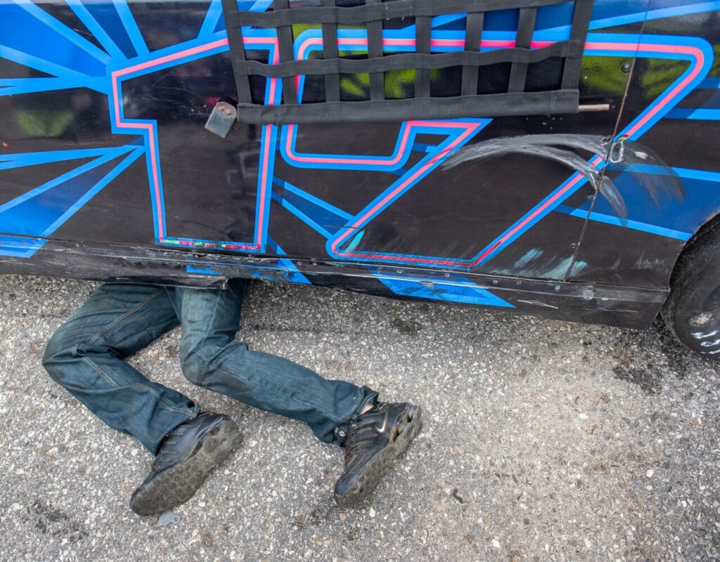 A pit crew member works under a race car in pit row at Oxford Plains Speedway on Sunday afternoon. Russ Dillingham/Sun Journal Buy this Photo