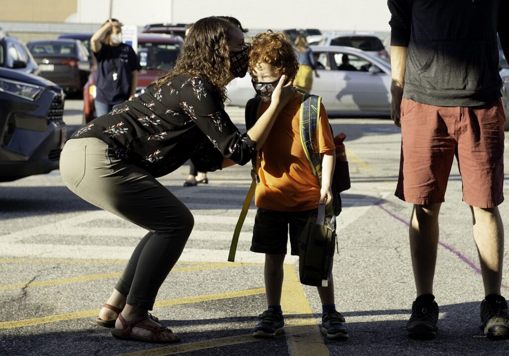 Robin Brochu of Lewiston gives her 5-year-old son, Andre Juarez Jr., a kiss before Juarez begins his first day of kindergarten at Acadia Academy in Lewiston on Thursday. The public charter school’s small population will allow students to attend five days a week, said director Brittiny-Rae Perron. Students and staff are required to wear masks throughout the school day except during outdoor “mask breaks,” when students sit six feet apart on “stump seats,” said Perron. Of the 257 students that attend Acadia, 40 have chosen to learn remotely. Parents will have the option to switch from one to another on November 5, said Perron. Juarez’s father, Andre Juarez Sr., is at right. Daryn Slover/Sun Journal Buy this Photo
