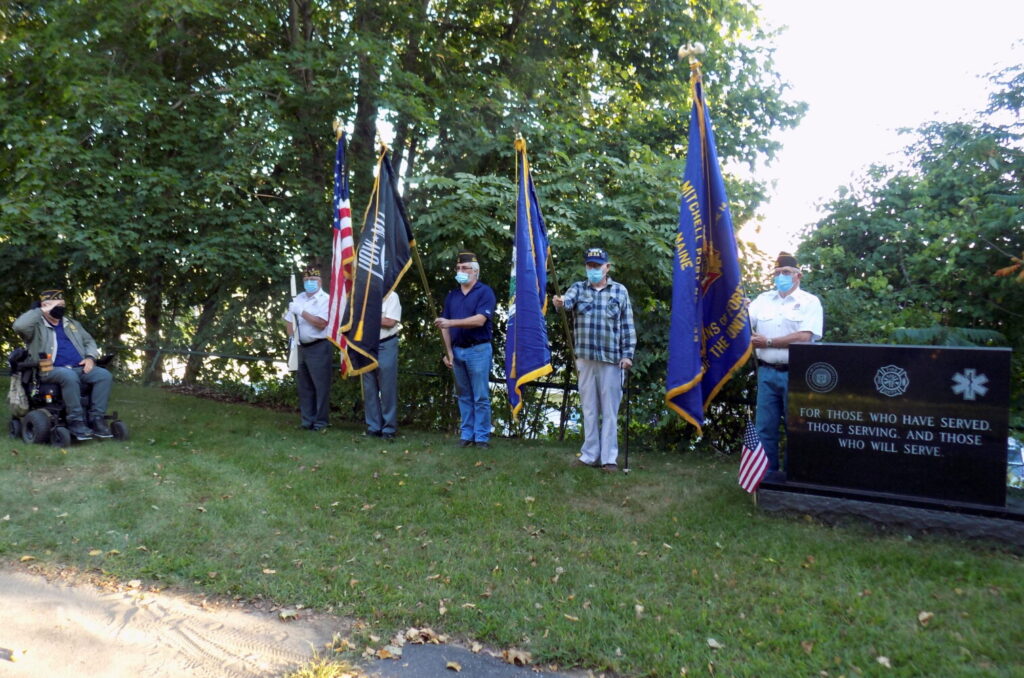 Members of American Legion, Veterans of Foreign Wars and AMVETS Posts in Jay, Livermore and Livermore Falls present the colors at a 9/11 remembrance service Friday at Union Park in Livermore Falls. A candlelight vigil marked the 19th anniversary of the terrorist attacks on the United States on Sept. 11, 2001, that claimed nearly 3,000 lives. Veteran Donald Simoneau, left, salutes veterans, from left, John Dube, Don Frechette, Rob Pelchat, Steve Paquette and David Lachapelle. Pam Harnden/Livermore Falls Advertiser