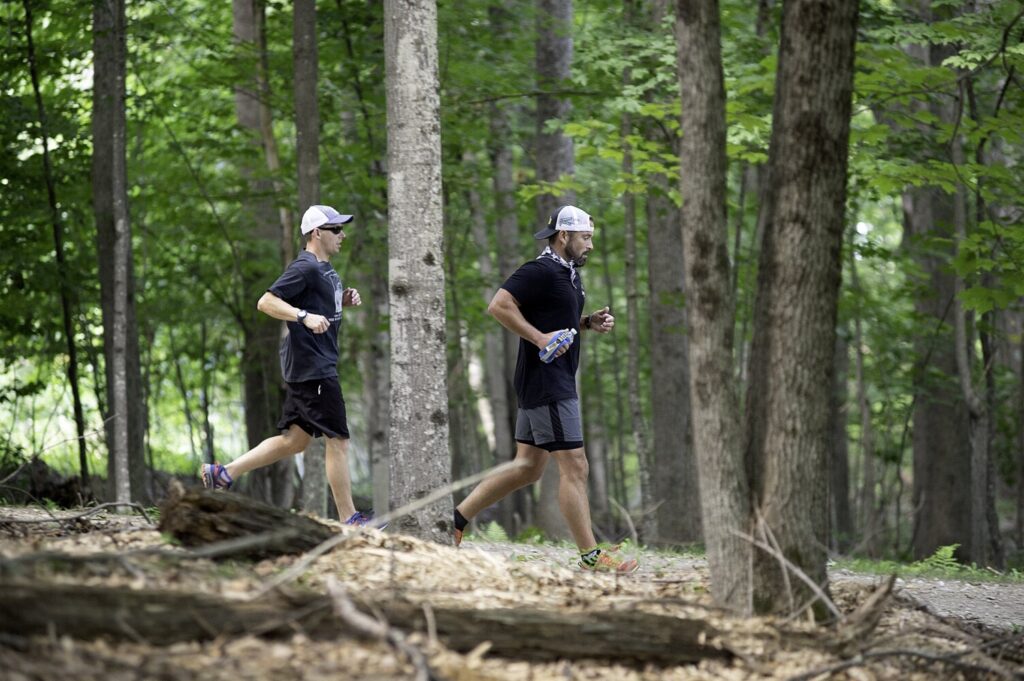 Fritz Kunas, left, and Travis Bashaw, both of Auburn, compete in the Last Man Standing Ultramarathon at Pineland Farms in New Gloucester on September 5, 2020. Kunas and Bashaw have been training since March for the ultramarathon, many times at 4 a.m. Daryn Slover/Sun Journal Buy this Photo