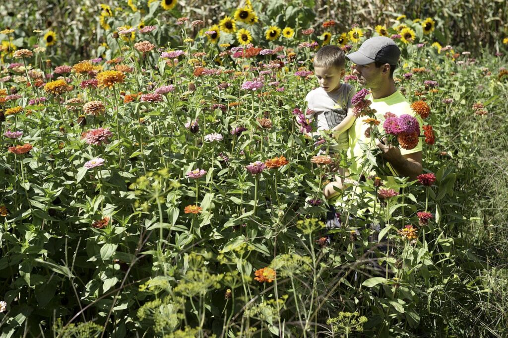 Caleb Eulitt of Minot and his son, Westin, 4, pick flowers from the pick-your-own garden at Slattery’s Farm & Maple Syrup Supply Co. in West Minot on September 6, 2020 . The flowers were for Eulitt’s wife and Westin’s mother, Brittany, and Eulitt’s mother and Caleb’s “Nana,” Belinda. Daryn Slover/Sun Journal