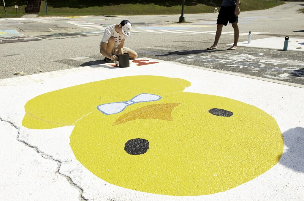 Edward Little High School senior Jimmy Pawlina paints his parking space at the school in Auburn on September 10, 2020. Seniors have this week to decorate their parking place. The annual tradition will come to an end in December when the parking lot will be used during construction of the new school, senior Thomas Brann said. Daryn Slover/Sun Journal Buy this Photo