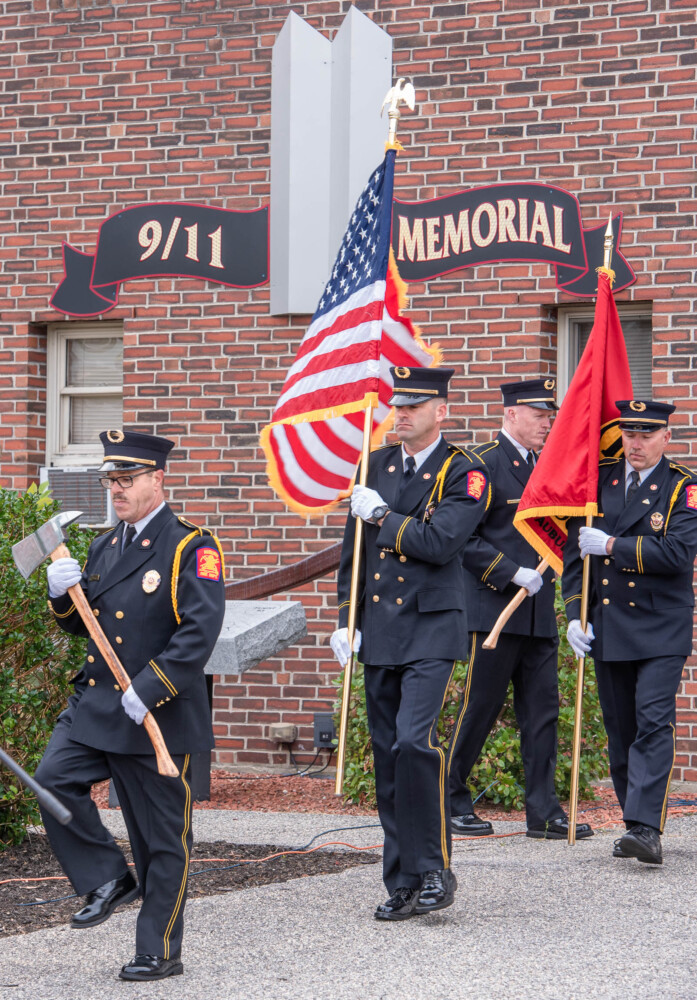 Honor Guard Dan Beaule, Aaron Warner, Scott Pray, and Mike Scott enter the 9/11 memorial service at the Auburn Fire Department on Friday morning. Andree Kehn/Sun Journal Buy this Photo