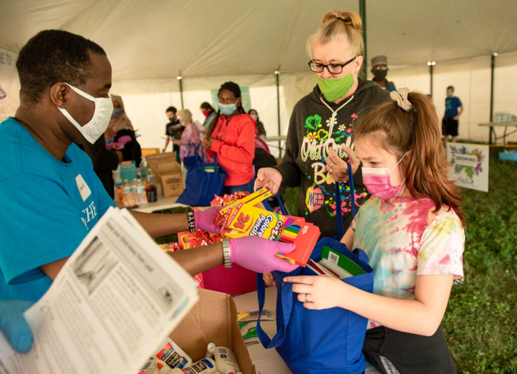 Hilowle Aden. left, hands school supplies to Lisa St Laurant and Morgan Reil, 11, at a Heathy Neighborhoods school supplies and PPE giveaway in Lewiston on Friday. Reil says she is excited to start up at Montello, because “It’s the good school”. The giveaway will continue on Saturday from noon- 4pm. Andree Kehn/Sun Journal Buy this Photo