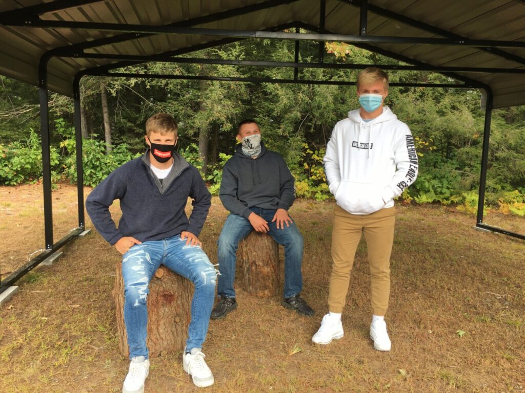 Mountain Valley High School senior Garrett Blodgett, junior Gabe Winson and sophomore Robert Leveillee sit on stumps that students will be using for seating during outdoor classes this semester. Marianne Hutchinson/Rumford Falls Times