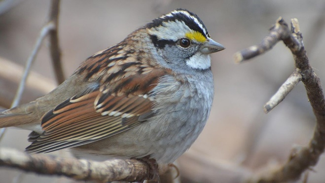 At this time of year, we start to see another LBB (Little Brown Bird) starting to move south from the higher elevations. In the fall I find them picking through the grass under my feeders or pecking at the gravel in my driveway. This LBB is stocky compared to other sparrows and has a reddish brown back and wings. Most notable is its clearly visible white throat. It has a black crown with a white stripe down the middle. The male shows a yellow spot on its lores, a region in front of its eye on both sides of its face.