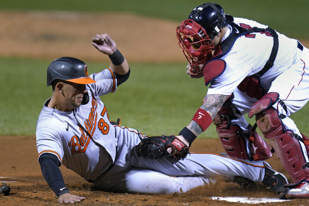 Boston Red Sox catcher Christian Vazquez, right, tags out Baltimore’s Ramon Urias, who tried to score on a lineout during the second inning Thursday at Fenway Park in Boston. AP Photo/Charles Krupa