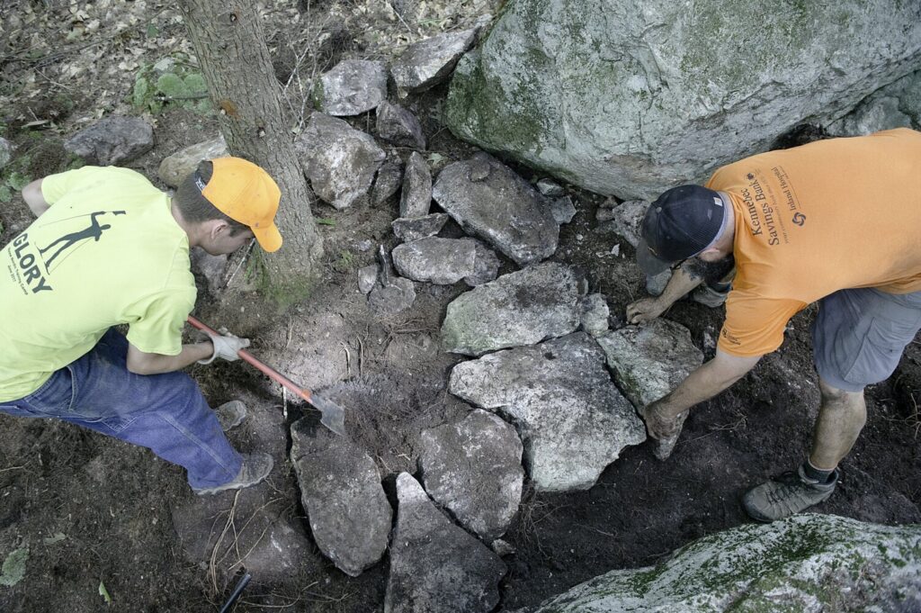 Wil Libby, right, of Livermore and Harry Bigos-Lowe of Auburn build a rock garden section of Carrie On, a new 1.3 mile mountain biking trail at Mount Apatite in Auburn on Aug. 3. Daryn Slover/Sun Journal file photo