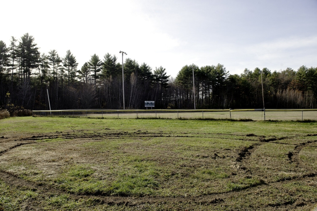 A vehicle drove onto grass and damaged a section of the Auburn Suburban Baseball and Softball Complex in Auburn. Daryn Slover/Sun Journal Buy this Photo