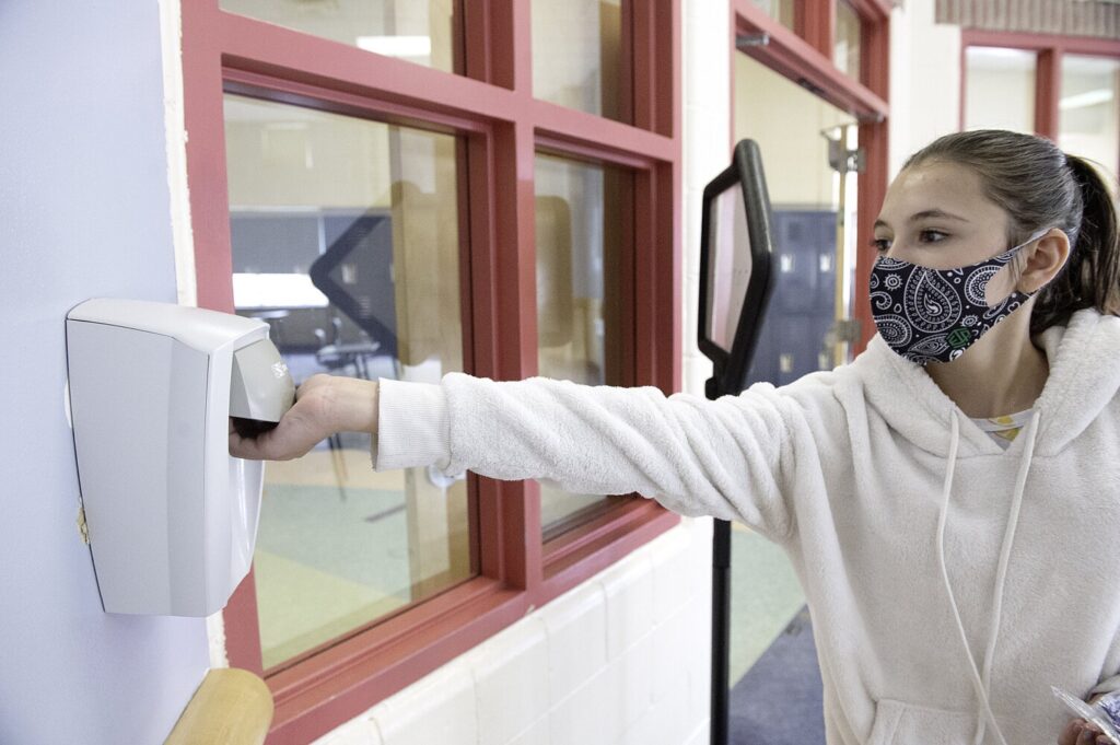 Regional School Unit 9 has been conducting hybrid instruction and halting in-person instruction when COVID-19 cases surface in schools. Pictured above is seventh-grader Alyisa Kinsey using hand sanitizer as she enters the lunchroom at Mt. Blue Middle School in Farmington. Daryn Slover/Sun Journal Buy this Photo