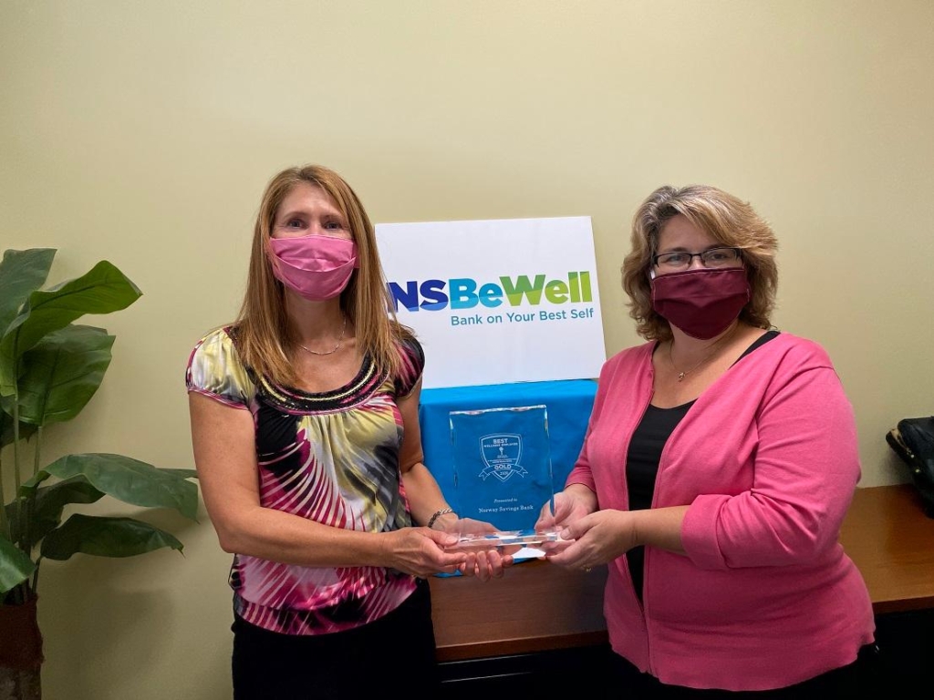 Norway Savings Bank employees Tricia Brooks, assistant vice president compliance and benefits administrator, left, and Patty Shields, vice president human resources operations manager, display the 2020 Best Wellness Employer Award.