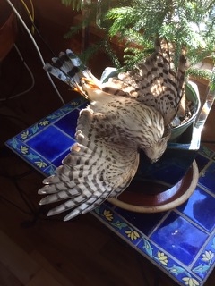 I was putting old chandelier crystals on my little Norfolk Island pine as I do every year around this time of year to honor all evergreens. It was almost November. I recalled a childhood experience … my little brother and I used to clink the beveled crystal pieces together in order to hear the music they produced when adults weren’t paying attention. Now each crystal shimmered like liquid rain caught by the late afternoon light. Suddenly a loud crash and thump interrupted my reverie. Oh no, a bird had hit the window – hard. I raced out the door. Yellow talons shuddered, but the hawk was dead when I reached it.