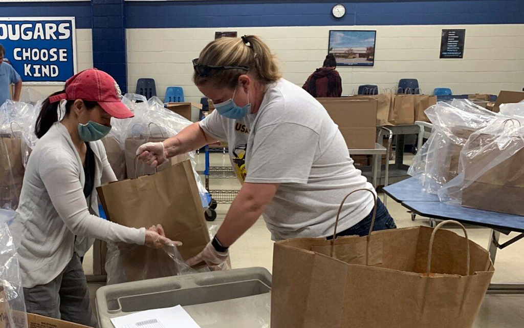 RSU 56 school psychologist Jessica Swan, left, packages meals with Dirigo High School Assistant Principal and Athletic Director Jess McGreevy at Dirigo Middle School in Dixfield in May. Buses deliver the food to the homes of students. Submitted photo