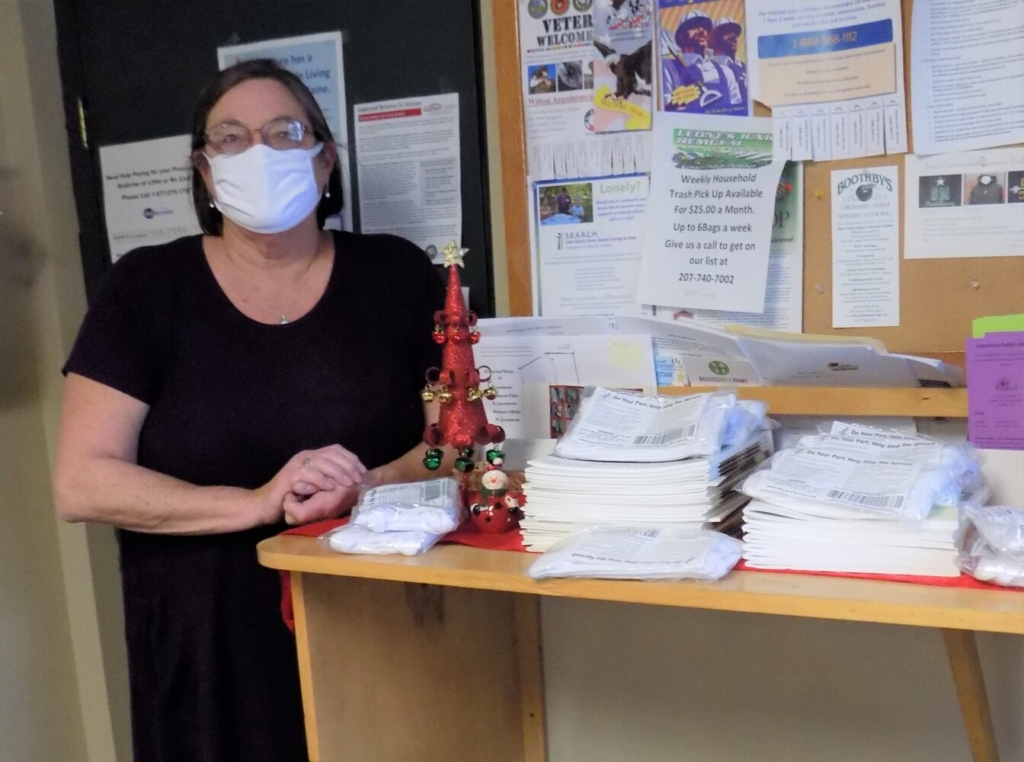 The Livermore Town Office has cloth masks available to those that need them. Deputy Clerk Jean Tardif stands beside a counter where some of the 5-packs of white masks are displayed. Pam Harnden/Livermore Falls Advertiser