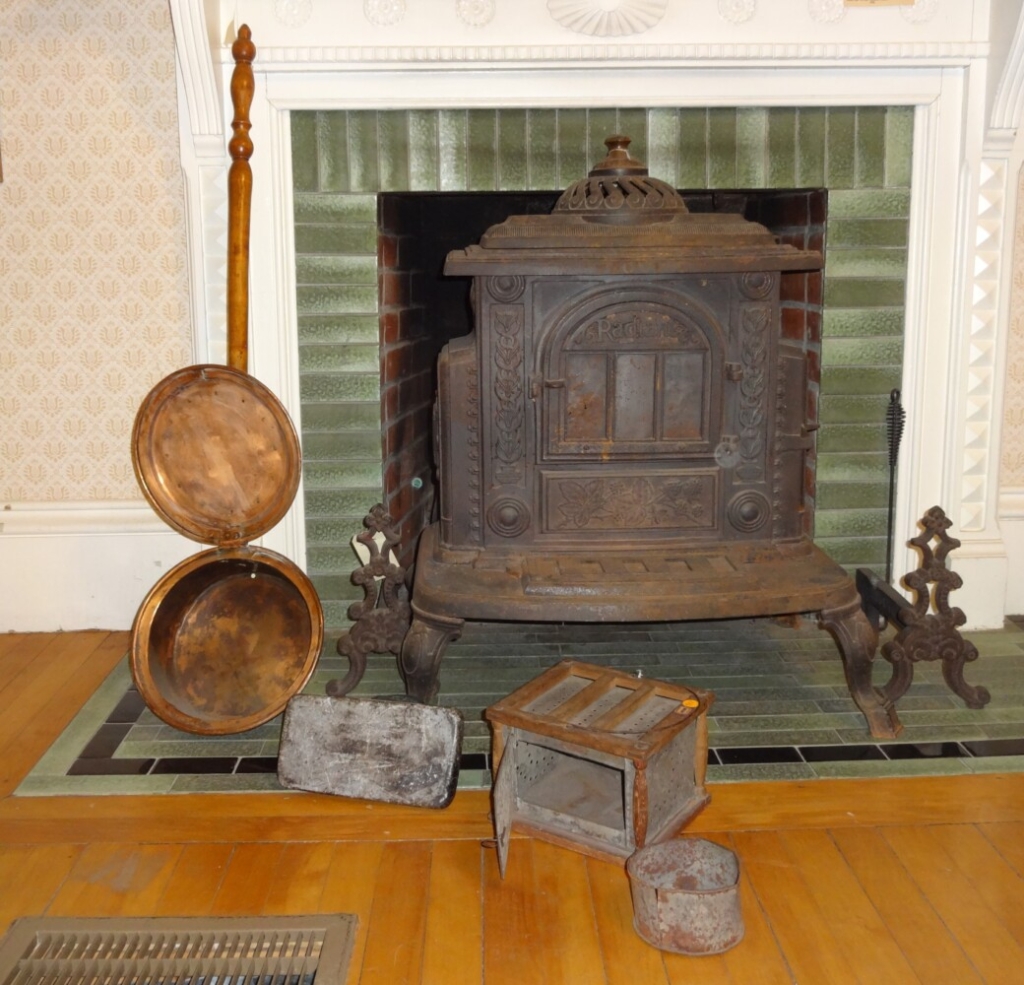 Two of these items were commonly used until the end of the 19th century to warm the bed prior to retiring for the night. The foot warmer was a portable heat source for use in unheated environs. The bed warming pan, soapstone and foot warmer were frequently stored near a fireplace or wood stove to be close to a source of hot embers.