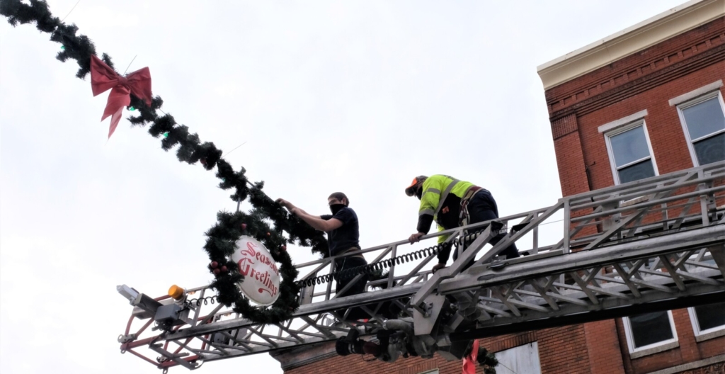 Rumford firefighter Mitch Dunbar, left, and Public Works Director Dale Roberts place a Season’s Greetings wreath Friday afternoon over Congress Street downtown. Beautify Rumford and town departments added to the holiday flags hung light poles and other decorations. A tree lighting ceremony was held Friday after dusk in Veterans Park at the end of Congress Street. Bruce Farrin/Rumford Falls Times