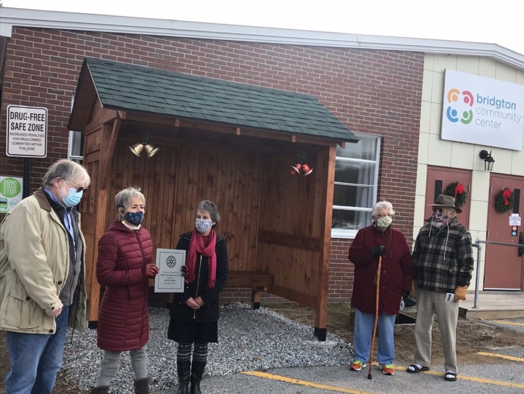 BRIDGTON — Ten Rotarians assembled briefly on Friday, December 4, to dedicate the Bus Stop Shelter at the Bridgton Community Center in the name of Rotarian Marlee Turner who passed two years ago. The Shelter is a Rotary project inspired by Marlee and championed by Dick Enright who worked with Lake Region High School Construction Work Center, which built this beautiful structure to top quality specifications as a community project.