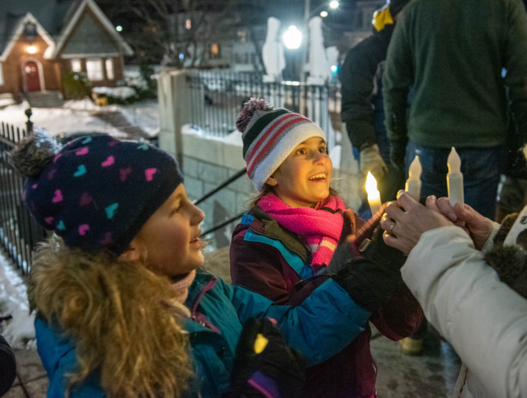Katherine Anne Russell, left, and Anna Fecteau hand their electric candles to Russell’s mother, Joanne, on Friday evening after an evening of Lessons and Carols on the front porch of the Basilica of Saints Peter and Paul in Lewiston. The traditional service of nine lessons tells the story of the fall of humanity, the promise of the Messiah, and the birth of Jesus in short Bible readings interspersed with Christmas carols and hymns. Andree Kehn/Sun Journal Buy this Photo