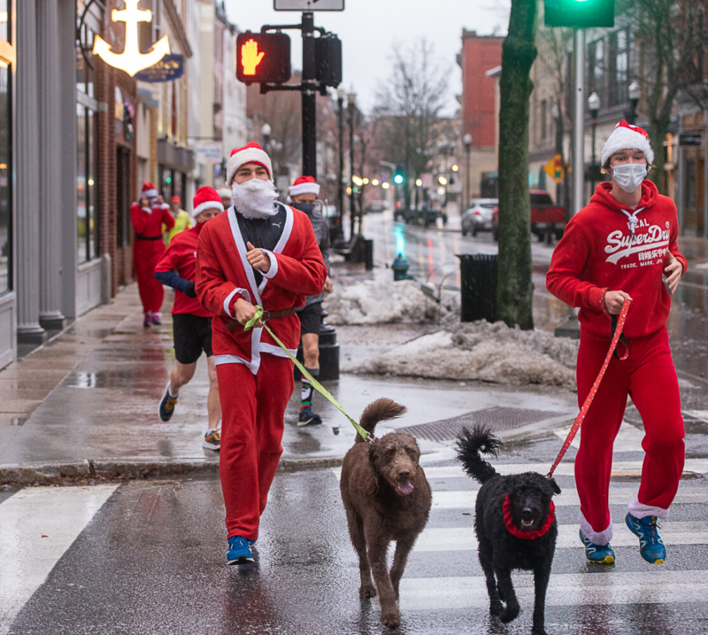 Santas and dogs cross Lincoln Avenue on Christmas morning on an annual Christmas run in Lewiston. Andree Kehn/Sun Journal Buy this Photo
