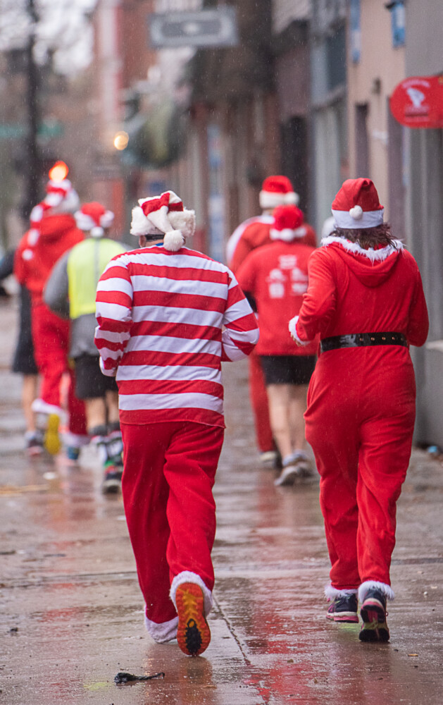 Santas run Christmas morning in the rain down Lisbon Street in Lewiston. Andree Kehn/Sun Journal Buy this Photo