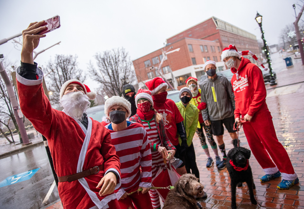 Maxi Kolb, an exchange student from Germany, takes a selfie photo of a group of Santas and elves getting ready for their annual Christmas morning run on Main Street in Auburn. The group gets together every Christmas morning and runs a loop through Lewiston Auburn. Andree Kehn/Sun Journal Buy this Photo