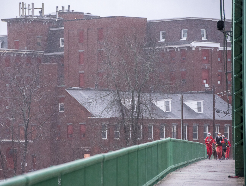 A group of running Santas cross the Bernard Lown Peace Bridge spanning Lewiston and Auburn on Christmas morning in the rain. The Continental Mill is in the background. Andree Kehn/Sun Journal Buy this Photo