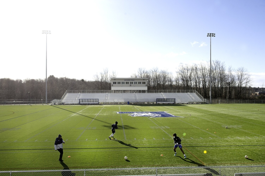 Former Lewiston High School assistant soccer coach Abdijabar Hersi, left, works with his brother Khalid Hersi, center, and Abdul-Jabaar Abdi on Tuesday on the school soccer field. “It’s what you do during the off-season that makes the difference,” the 2008 graduate of LHS said. He said one reason the team has had so much success is members play a lot of “street soccer” whether it is in season or out of season. “Street soccer is where kids learn individual creativity,” Hersi said. “You can’t ask for anymore, the coach just has to teach them how to work as a team at that point.” Daryn Slover/Sun Journal Buy this Photo
