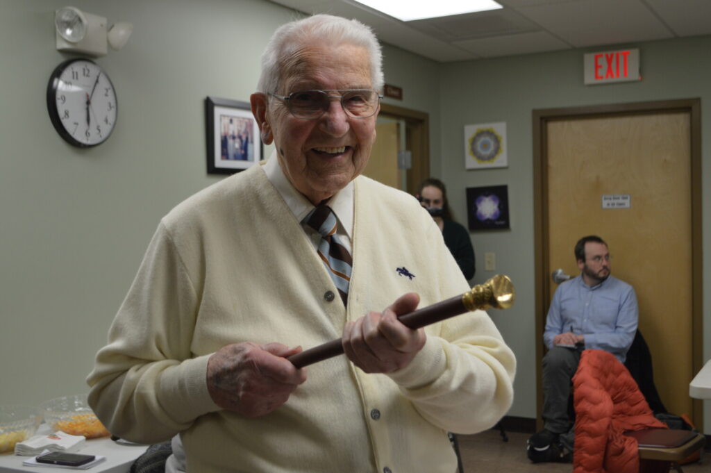 Arthur “Benny” Benedetto, 101, the oldest resident of Jay, holds a copy of the Boston Post Cane presented to him in January by Town Manager Shiloh LaFreniere. Donna M. Perry/Sun Journal