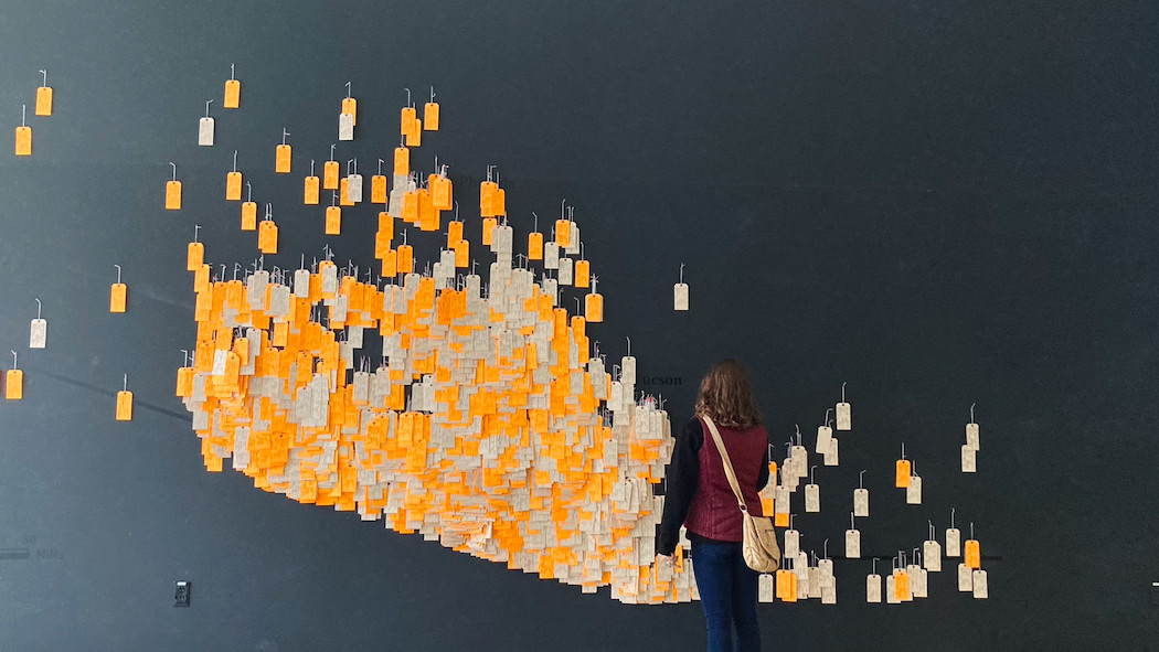 Hostile Terrain 94 is a visual anthropology project consisting of toe tags that outline where people have perished in the Sonoran Desert as they attempted to cross the U.S.-Mexico border. The 3,200 mapped tags are on display at 150 Main Street in Waterville. Photo courtesy of Ciera Miller