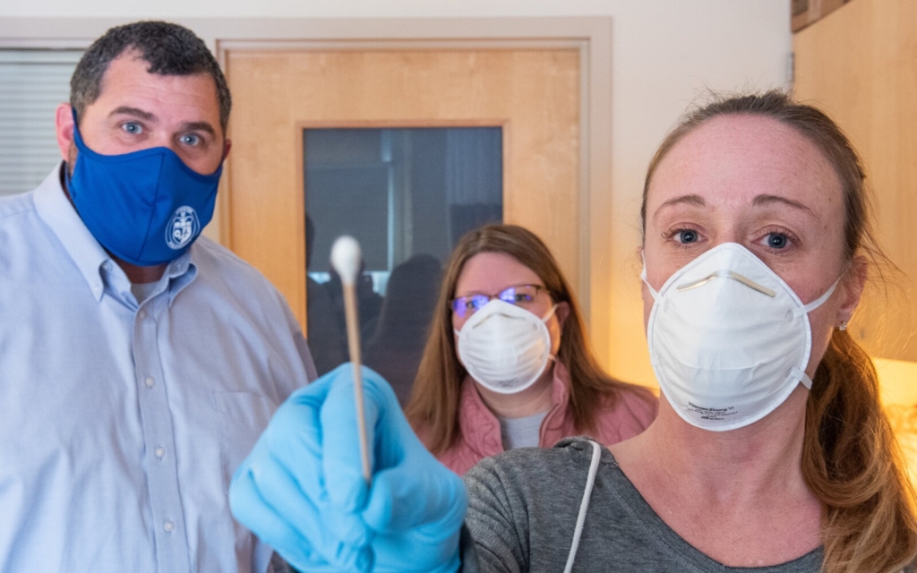 Lewiston School Superintendent Jake Langlais, left, has been innovating and adapting COVID-19 procedures on the fly over the course of the pandemic. Friday afternoon he was at Lewiston Middle School going over plans for a drive-through testing for staff next week at the middle school. With the help of St. Mary’s Health Care, Lewiston school nurses will test swabs they collect, like the one Lewiston High School nurse Melissa Gendron is holding, right. They were in the office of middle school nurse Wendie Bourgoin, middle. Russ Dillingham/Sun Journal