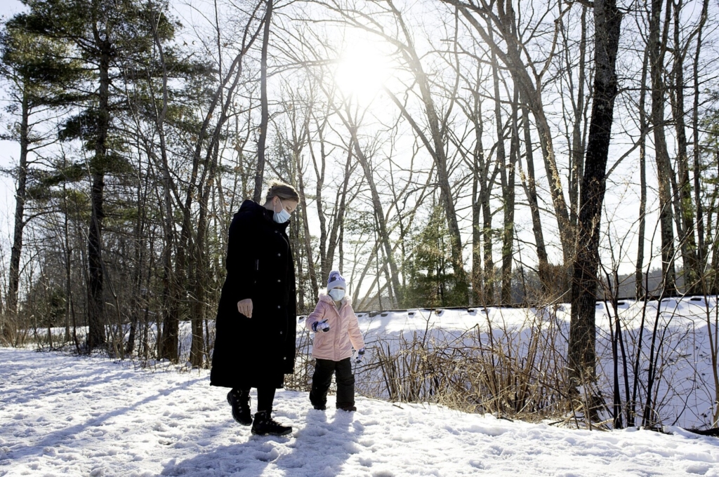Annissa Morgan of Lisbon Falls and her 5-year-old daughter, Daphne Martel, walk Friday along the Paper Mill Trail in Lisbon. Martel said she is on a hybrid learning schedule and Friday was a remote learning day. Daryn Slover/Sun Journal Buy this Photo