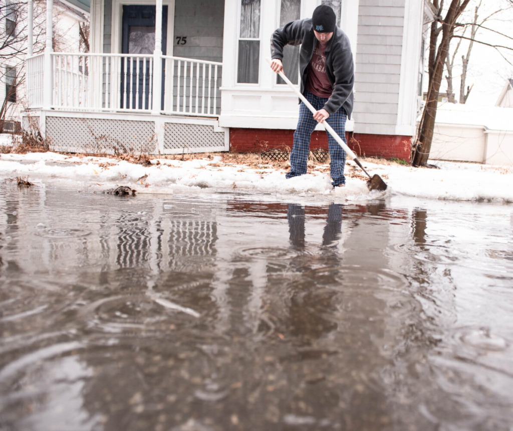 Brandon Hatch clears the storm drain near his home on High Street in Auburn in Saturday during a heavy rain. “It backs up too much, so I have to do this,” Hatch said. Andree Kehn/Sun Journal Buy this Photo