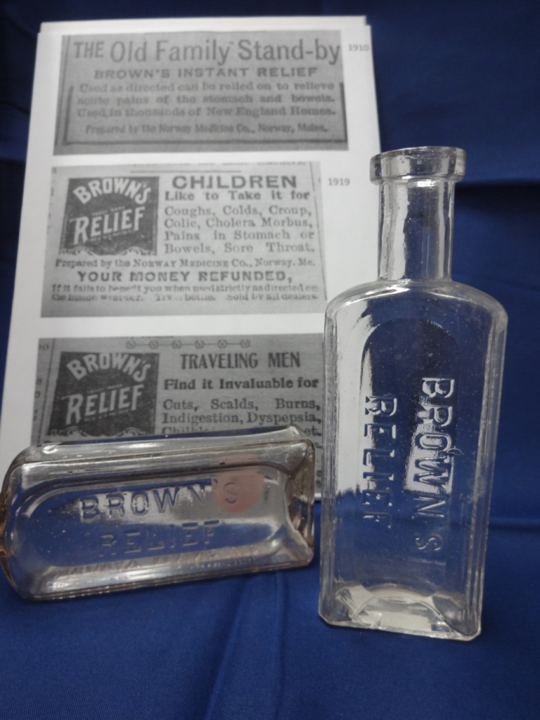 Brown’s Instant Relief bottles as well as other medicine containers and related advertisements are among the many artifacts in the collection of the Norway Museum and Historical Society. Although we must be closed to the public now, we look forward to welcoming you when we can reopen. To view some of our past programs visit us at www.norwayhistoricalsociety.org.