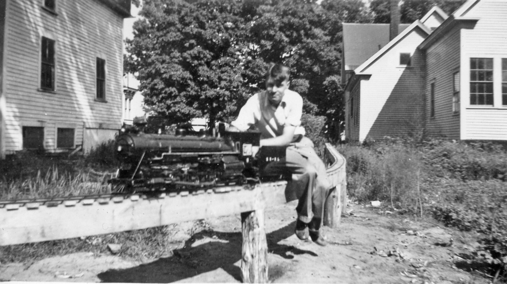 It wasn’t enough to just build these steam and smoke belching units, Gene operated his creations on a track off Skeetfield Road in Oxford and traveled to Massachusetts for live steam meets. When the Skeetfield Rd. site was abandoned, Gene managed to salvage enough track to construct an elevated setup in his Fair St. backyard. In the picture you can see the “engineer” riding on a flatcar hauled by the locomotive. There is even a small shovel for throwing coal from the tender into the boiler.