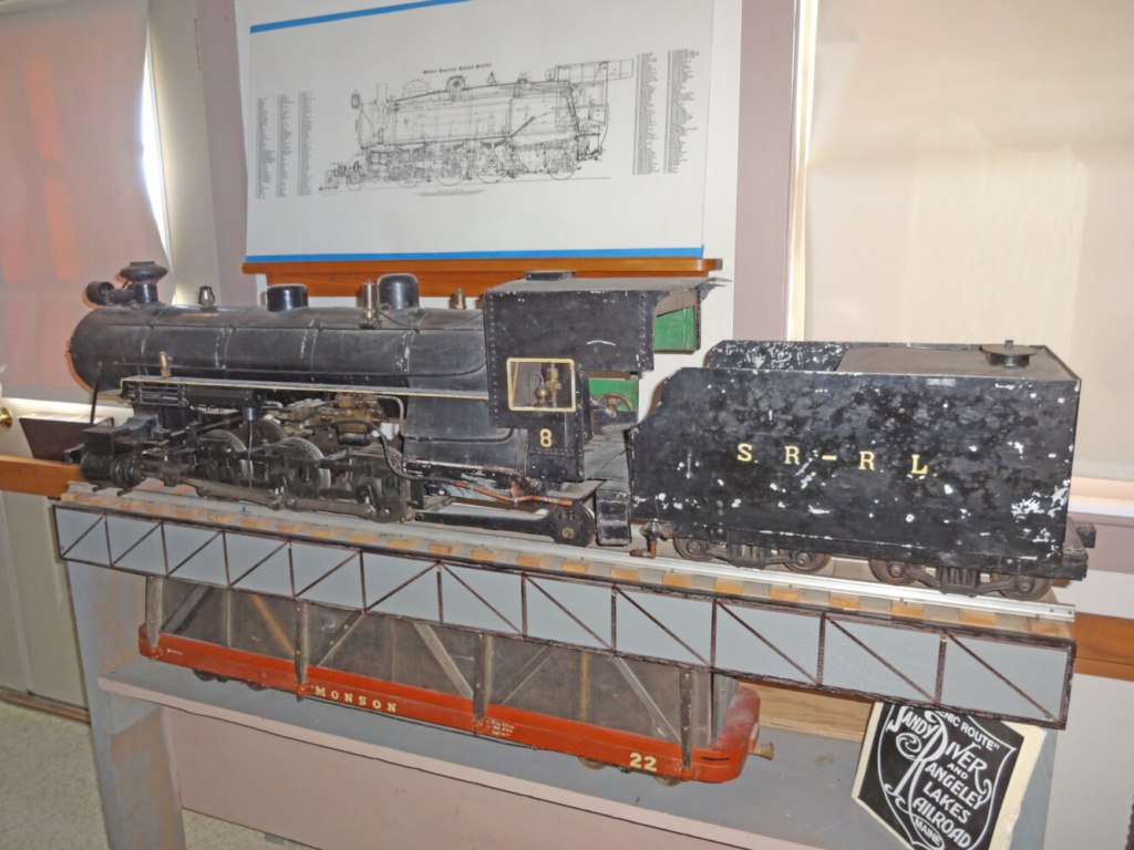 The locomotive on display at the Historical Society shows the name “Sandy River & Rangeley Lakes Railroad” and is assigned the number 8. The SR & RL Railroad was a narrow gauge railroad that during its time had a number of engines similar to this. Gauge refers to the distance between the rails: standard gauge is 4 feet 8 ½ inches and narrow gauge in Maine was predominately 2 feet.