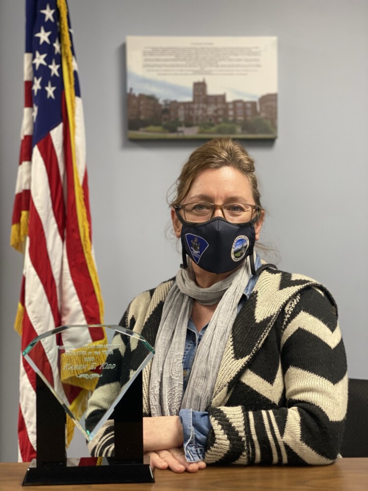 Farmington Police Department Office Manager Karen Kidd with her 2020 employee of the year recognition award. Kidd joined the department in July of 2019 and was praised by Interim Chief of Police Shane P. Cote for her dedication, commitment and positive attitude. Photo Courtesy of Farmington Police Department