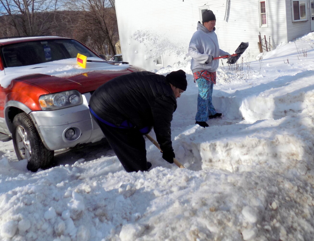 Wednesday morning, Feb. 3, Freddie Figueroa at left and Mary Jordan clear the end of a driveway in Livermore Falls. According to the National Weather Service, Livermore Falls received 6.5 inches of snow but ends of driveways were packed with much more. Pam Harnden/Livermore Falls Advertiser