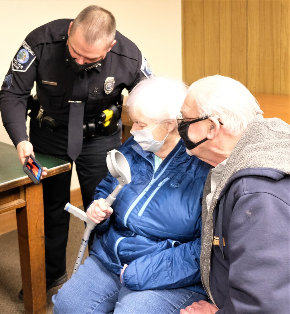 Rumford Police Cpl. Lawrence Winson shows Sharon and Don Cummings on Tuesday footage of their burning home in Mexico recorded Dec. 2 on his uniform cam. The couple attended a ceremony Tuesday when Winson and Patrolman Robert Haseltine were commended for rescuing the couple from their home. Bruce Farrin/Rumford Falls Times