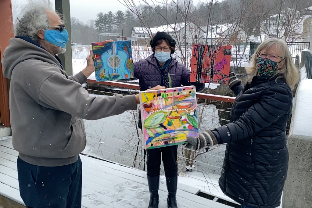 This idea went through the minds of Peter Herley, Nikki Millonzi and Judy Schneider as they thought about how they would like to approach an art show on the walls of Café Nomad in March. Why not each start a painting and then pass it on to the next person? The next person would work on it after hearing what the first artist had in mind as they were painting. Each person could continue with the theme or take off in another direction. Finally each piece would be entrusted to the third person to work on and potentially finish. If not finished they could see who would like to do that. The one caveat is that there must be some bit of each artists’ work showing in the finished piece. All had to agree that the artwork was done. They passed 12 pieces through this cycle over the last few weeks.