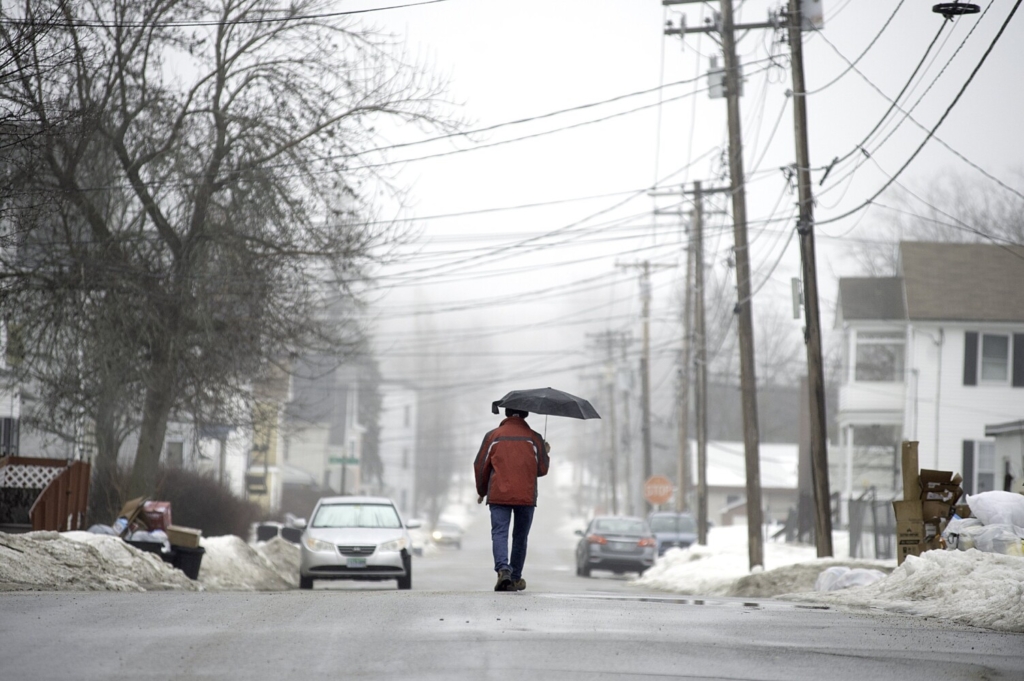 A man walks on a wet Monday along Winter Street in Lewiston. High winds and cold temperatures are expected Tuesday across Maine. Daryn Slover/Sun Journal Buy this Photo