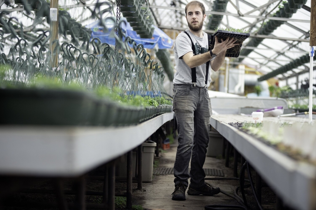 Tanner Paladino of Auburn carries a flat of African daisies Monday at The Whiting Farm in Auburn. Paladino said the farm is anticipating that the increased interest of new gardeners will continue this spring as the COVID-19 pandemic enters its second planting season. Daryn Slover/Sun Journal Buy this Photo