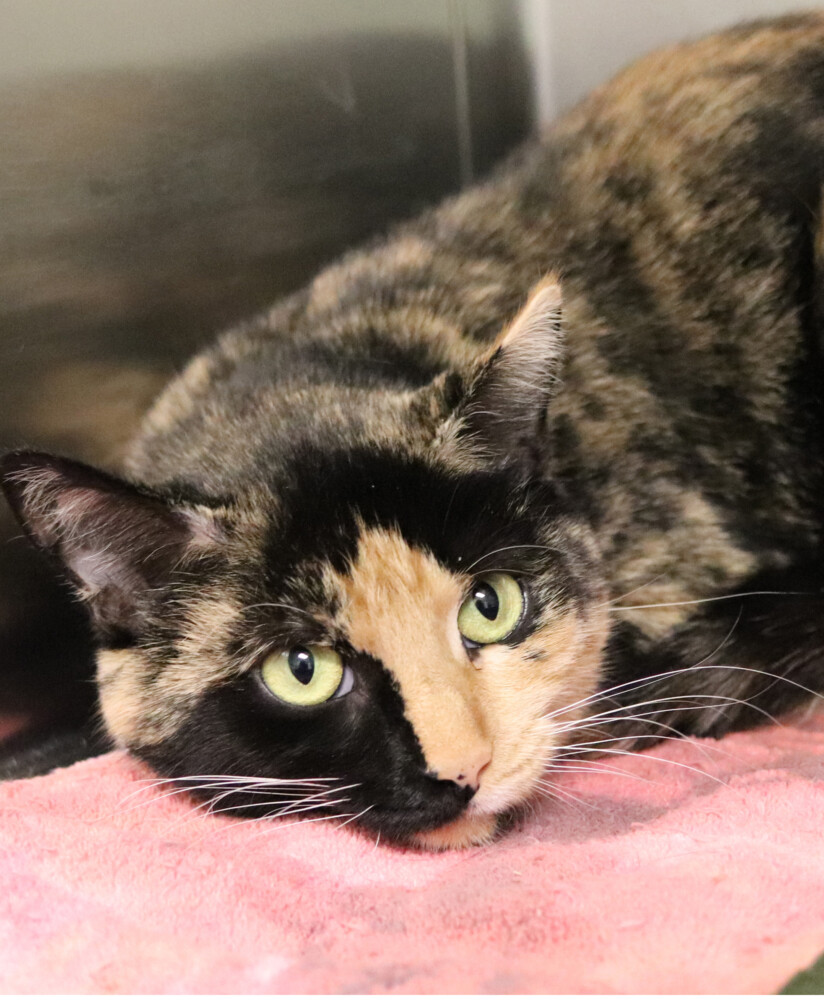 This is Joyce. She is a two year old, tortoiseshell cat. She is beautiful and she is in charge. She likes to make friends on her on terms. She responds to a gentle touch and likes to pay attention to whoever is talking to her. She will engage in some playtime when she feels like it. You will either love her or you won’t, and that’s alright with Joyce.